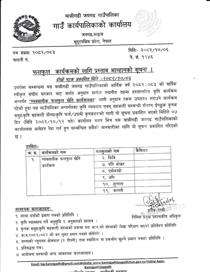 फलफुल कार्यक्रमको लागी प्रस्ताव आव्हानको सूचना |