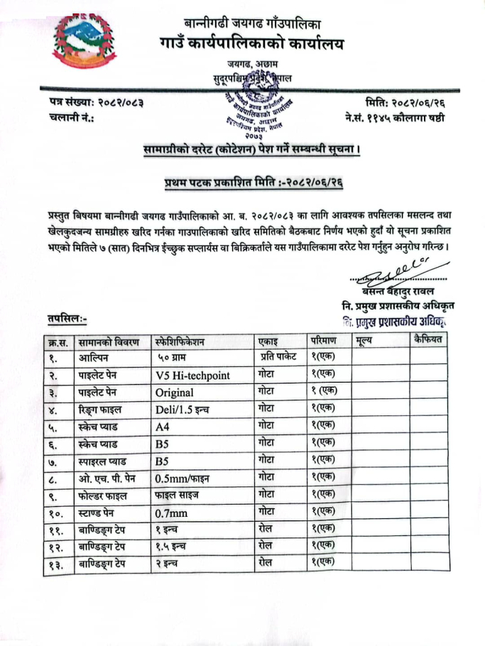 सामग्रीको दर रेट (कोटेशन) पेश गर्ने सम्बन्धी सूचना |