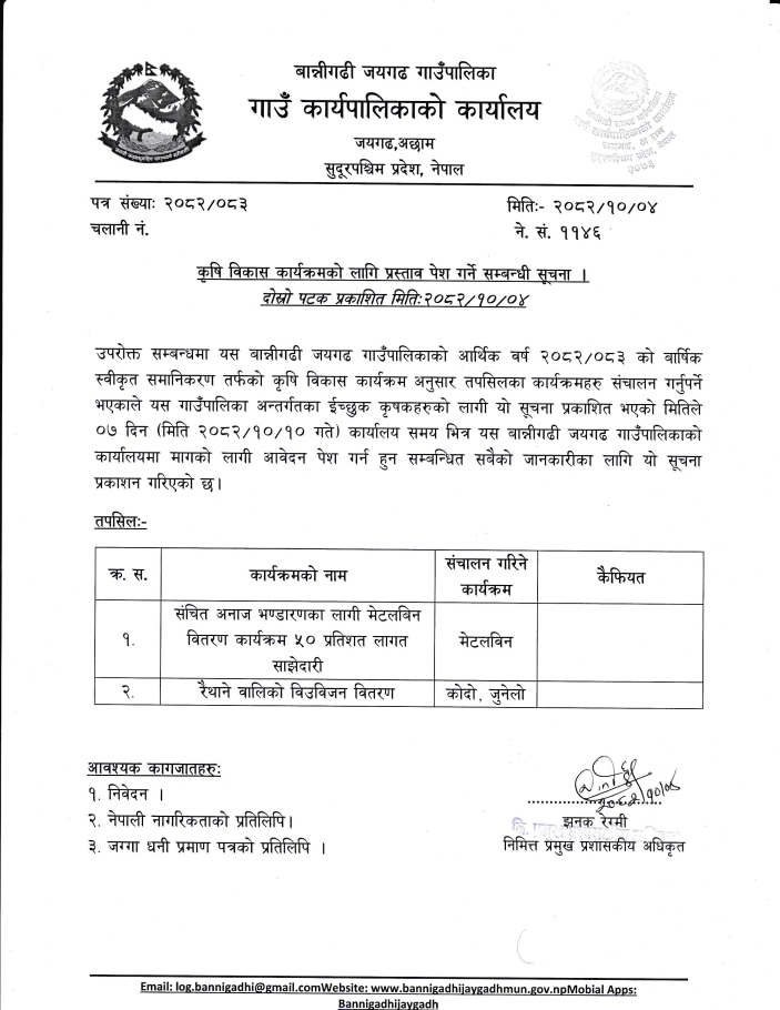 कृषि विकास कार्यक्रमको लागी प्रस्ताव पेश गर्ने सम्बन्धि सूचना |