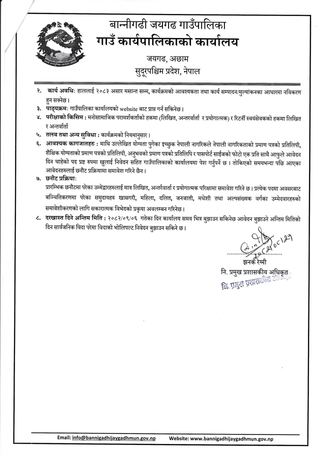 मनोसामाजिक परामर्शकर्ता र रिटर्नी स्वयंसेवक पदमा करार सेवामा कर्मचारी पदपूर्ति सम्बन्धी सूचना |