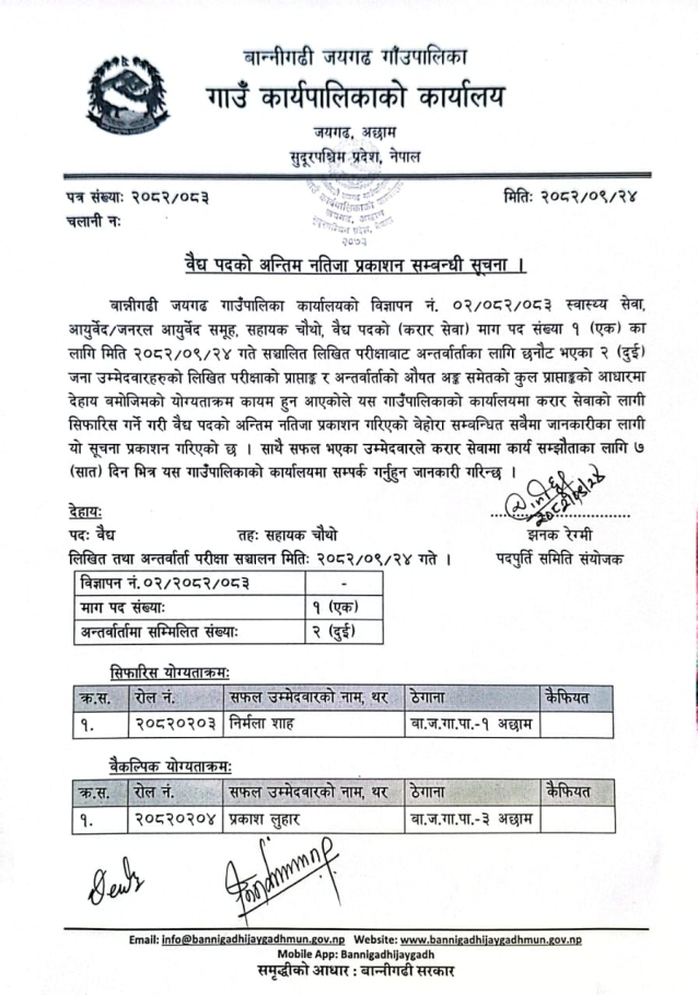 वैध पदको अन्तिम नतिजा प्रकाशन सम्बन्धि सूचना |