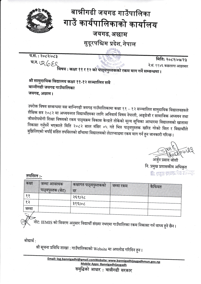 कक्षा ११ र १२ को पाठ्यपुस्तकको रकम माग गर्ने सम्बन्धमा |
