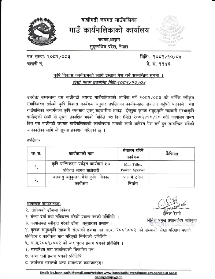 कृषि विकास कार्यक्रमको लागी प्रस्ताव पेश गर्ने सम्बन्धि सूचना |