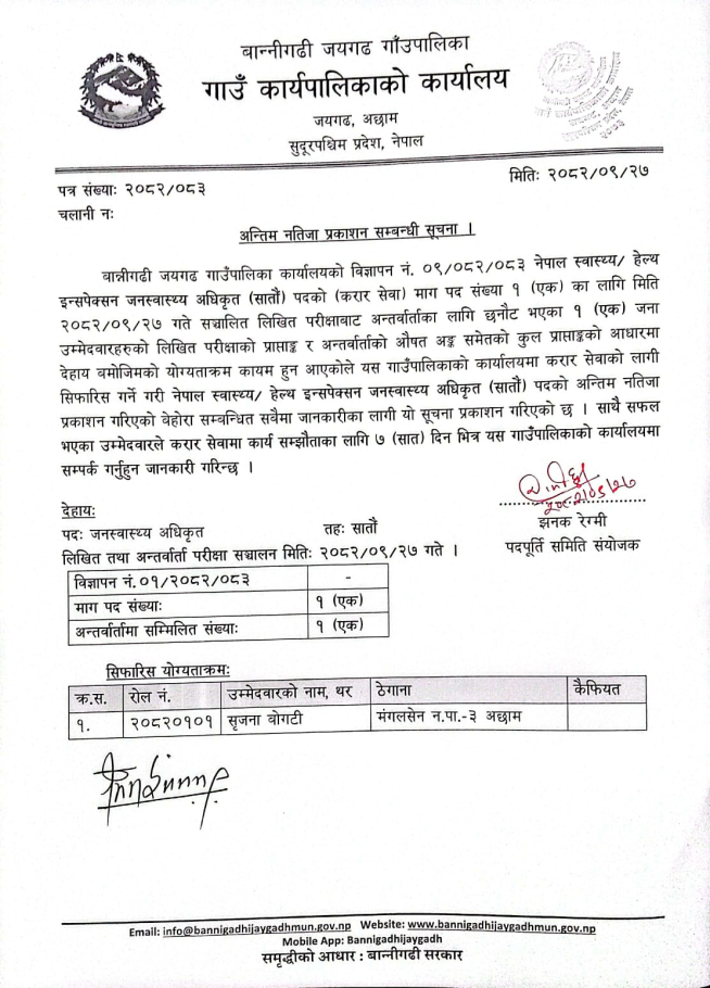 जन स्वास्थ्य अधिकृत पदको अन्तिम नतिजा प्रकाशन सम्बन्धमा सूचना |