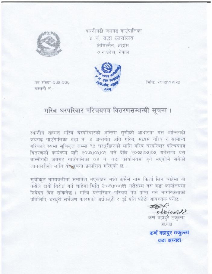 बान्नीगढी जयगढ़ गाउँपालिकाका वडा न. ४ का अन्तर्गत गरिब घरपरिवार परिचयपत्र बितरण सम्बन्धी सुचना