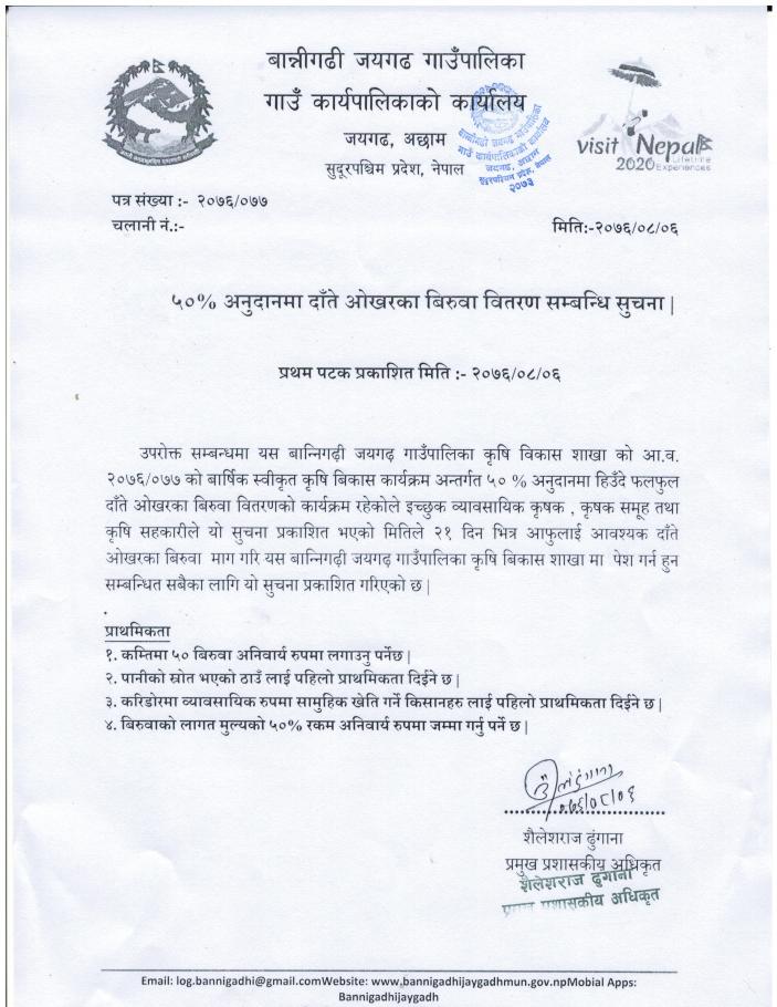 ५०% अनुदानमा दाते ओखरका बिरुवा वितरण सम्बन्धित सूचना |